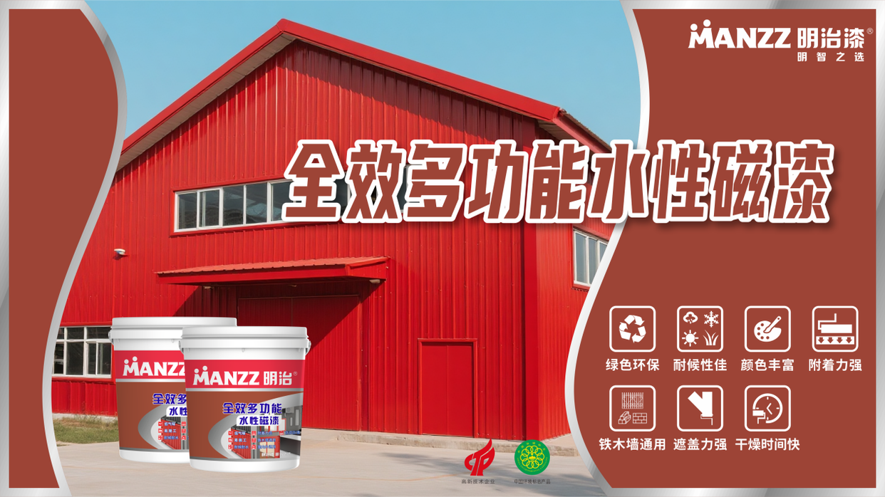 明治全效多功能水性磁漆是一款铁木通用的新型环保水性涂料,漆膜能抵御天气及环境侵蚀,对室内外铁木件提供卓越的保护。具有水性环保,柔韧性坚固,光泽饱满持久,美观耐用及可调配多种色彩等特点。同时以清水调代替传统有机溶剂,净味环境,4小时即可重涂,施工简单。适用于门窗、暖气片、护栏等表面的保护和装饰作用。